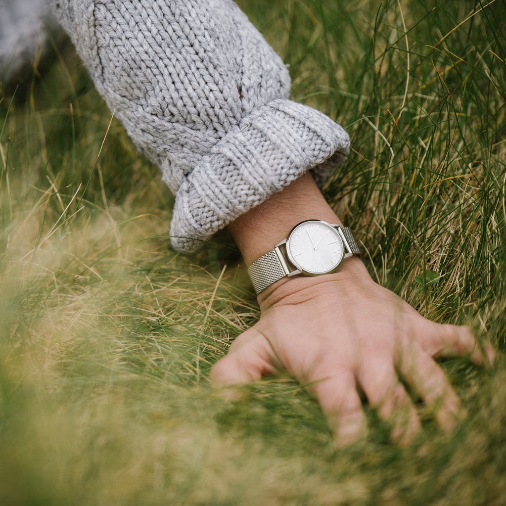 NEW - The limited edition 30mm silver women's watch, with a milanese mesh strap, combines the classic detailing of vintage watches with a modern minimalist finish. Created by British designer